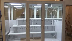 Внутри установлен стеллаж для цветов "ФлораЛайн".На задней стенке установлены зеркала.