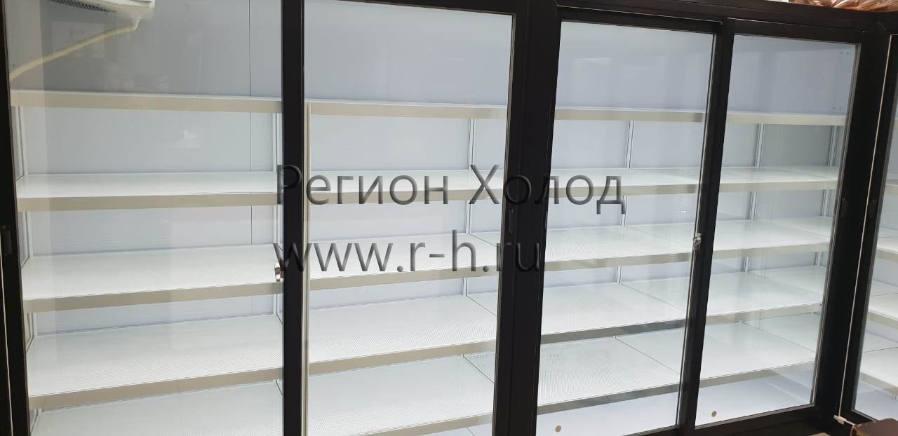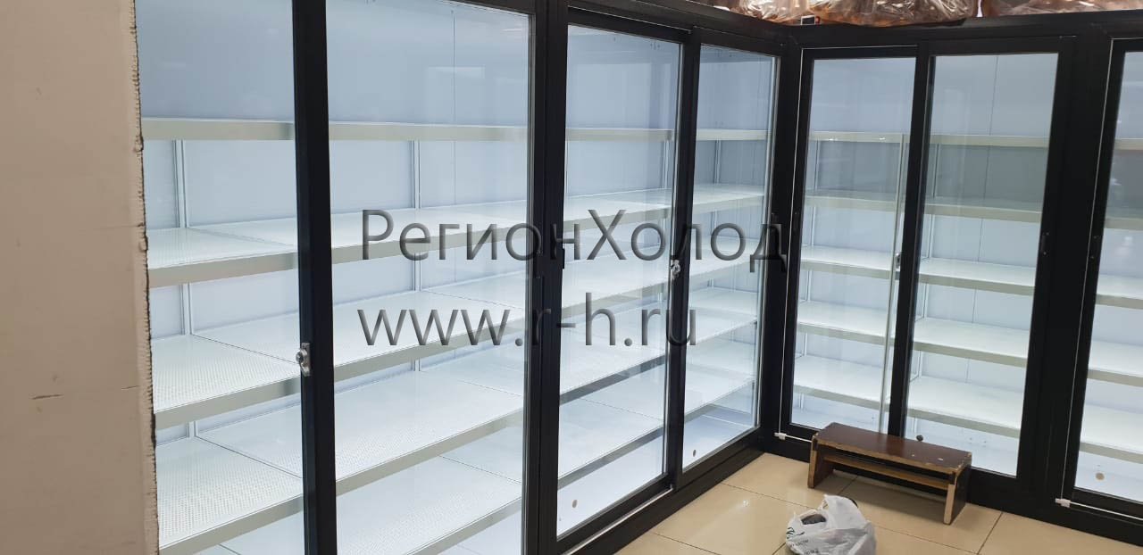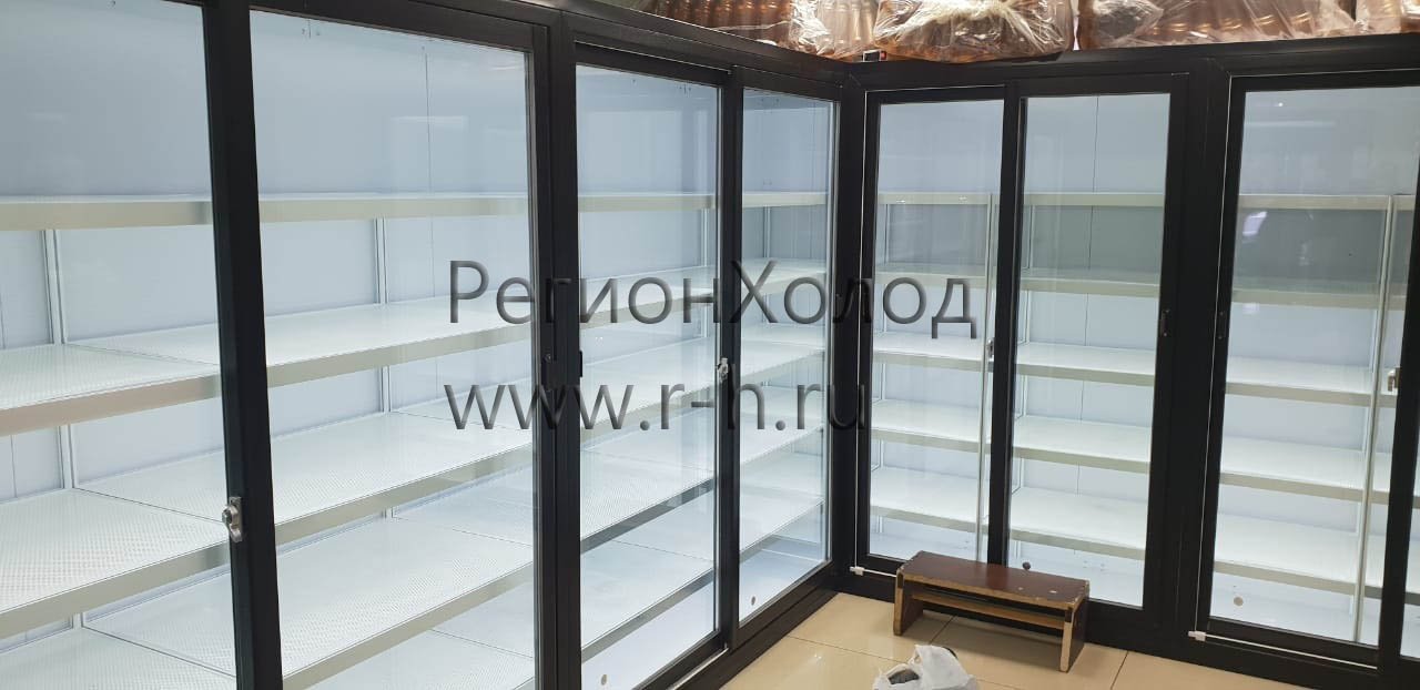 Угловая холодильная витрина для пива.Фасад окрашен в темный цвет.