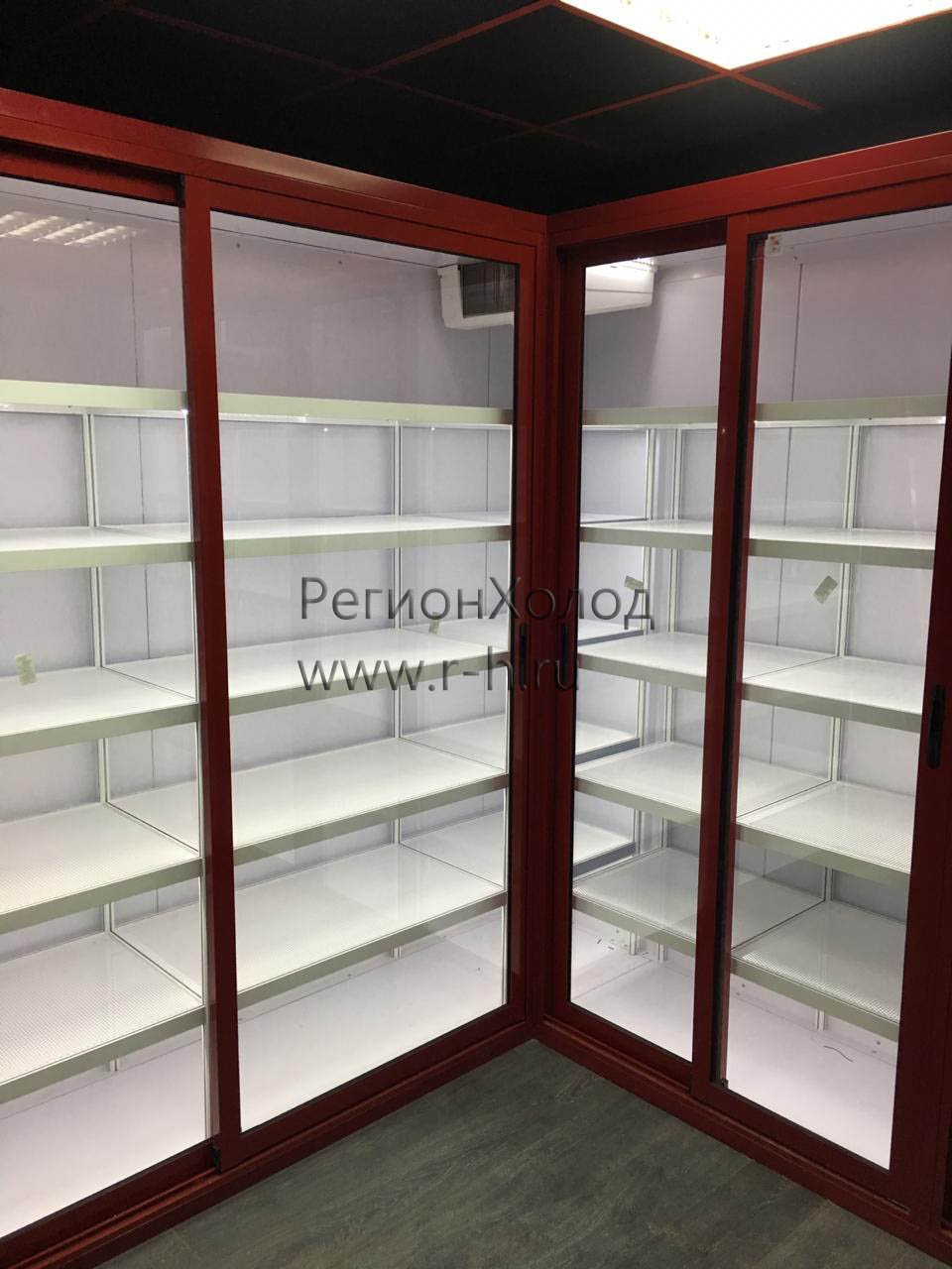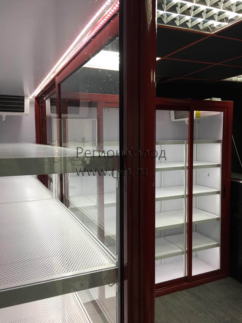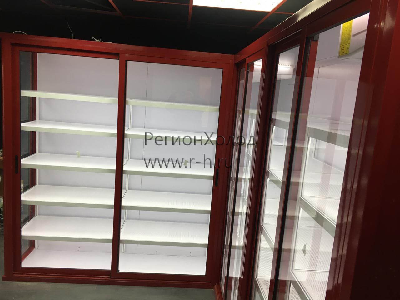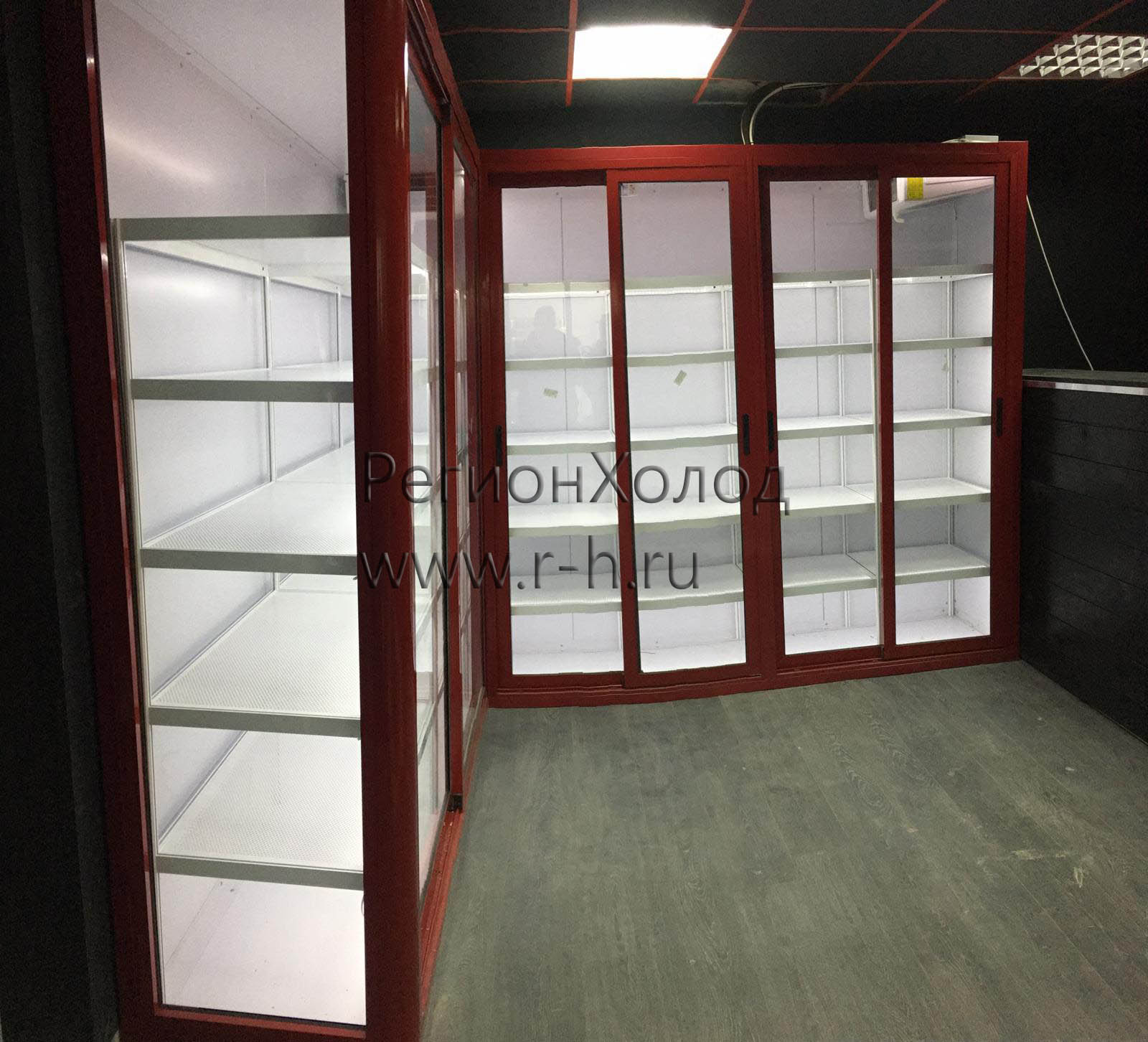 Холодильные камеры для пивного магазина.Витрина угловая, красного цвета. раздвижные двери купе.