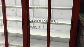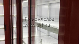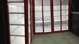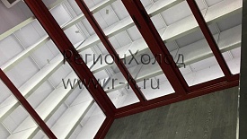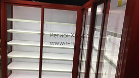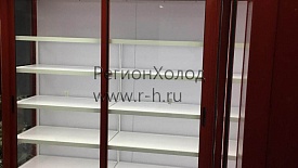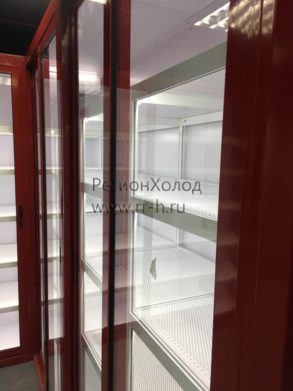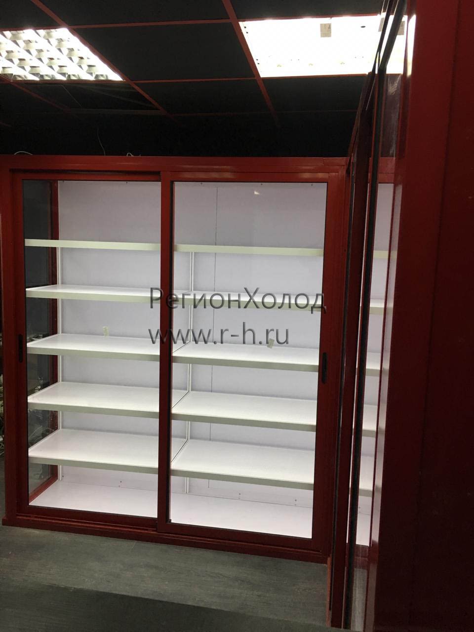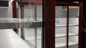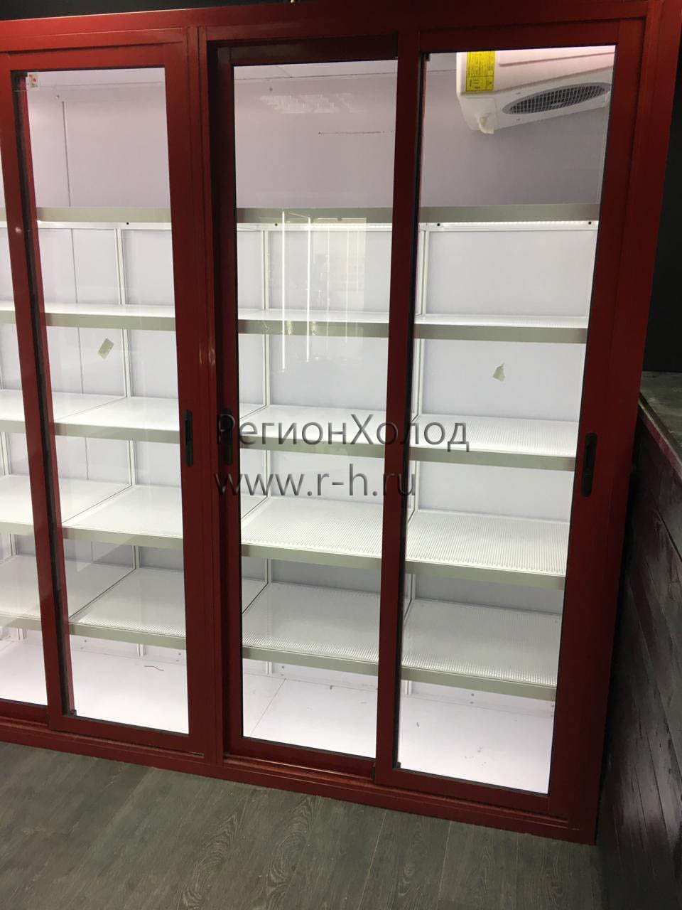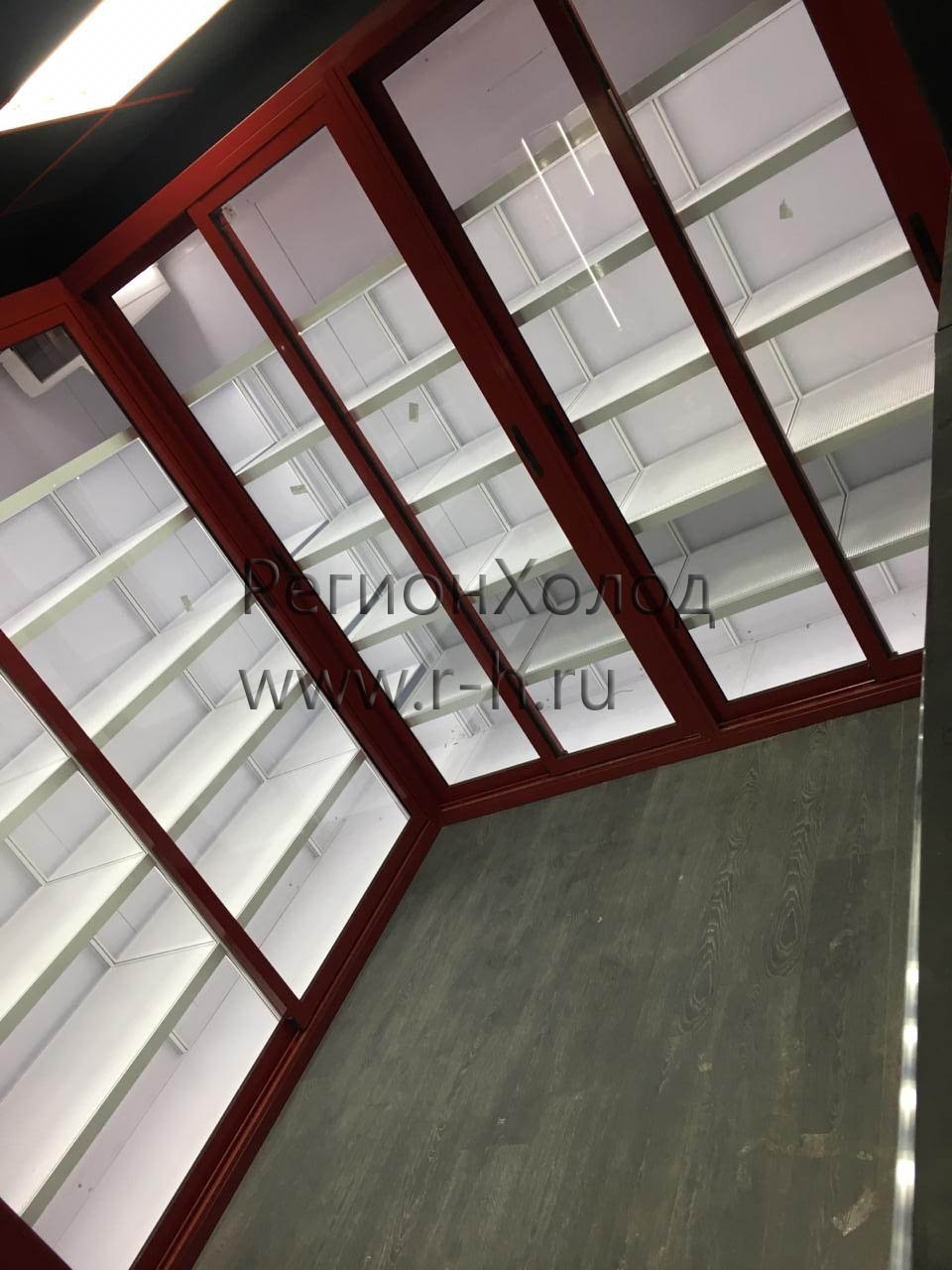 Холодильные камеры для пивного магазина.Витрина угловая, красного цвета. раздвижные двери купе.