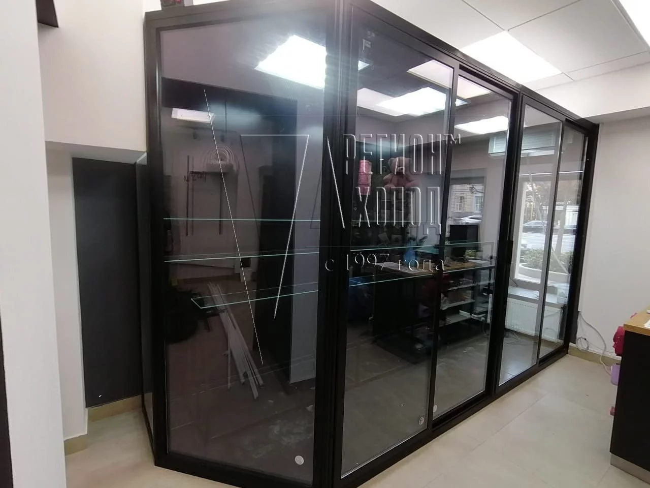 Холодильная камера для цветов.Фасады из алюминиевого профиля, выкрашены в чёрный цвет. Двери раздвижные.