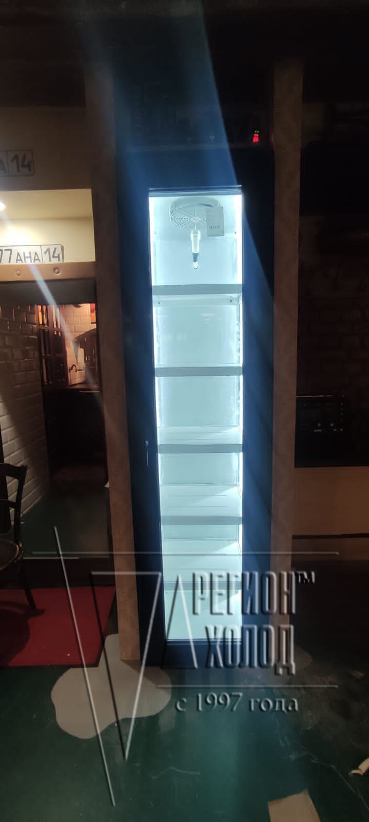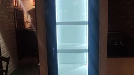 Изготовлено и установлено два холодильных шкафа.Вертикальный шкаф с распашной дверью вписан в имеющуюся в стене нишу.