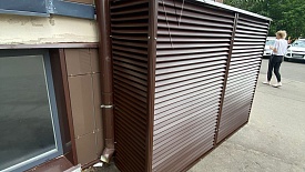На объект изготовлен по индивидуальному размеру и установлен защитно-декоративный кожух для холодильного агрегата и кондиционера.Кожух изготовлен из алюминиевого профиля, окрашен порошковой краской.