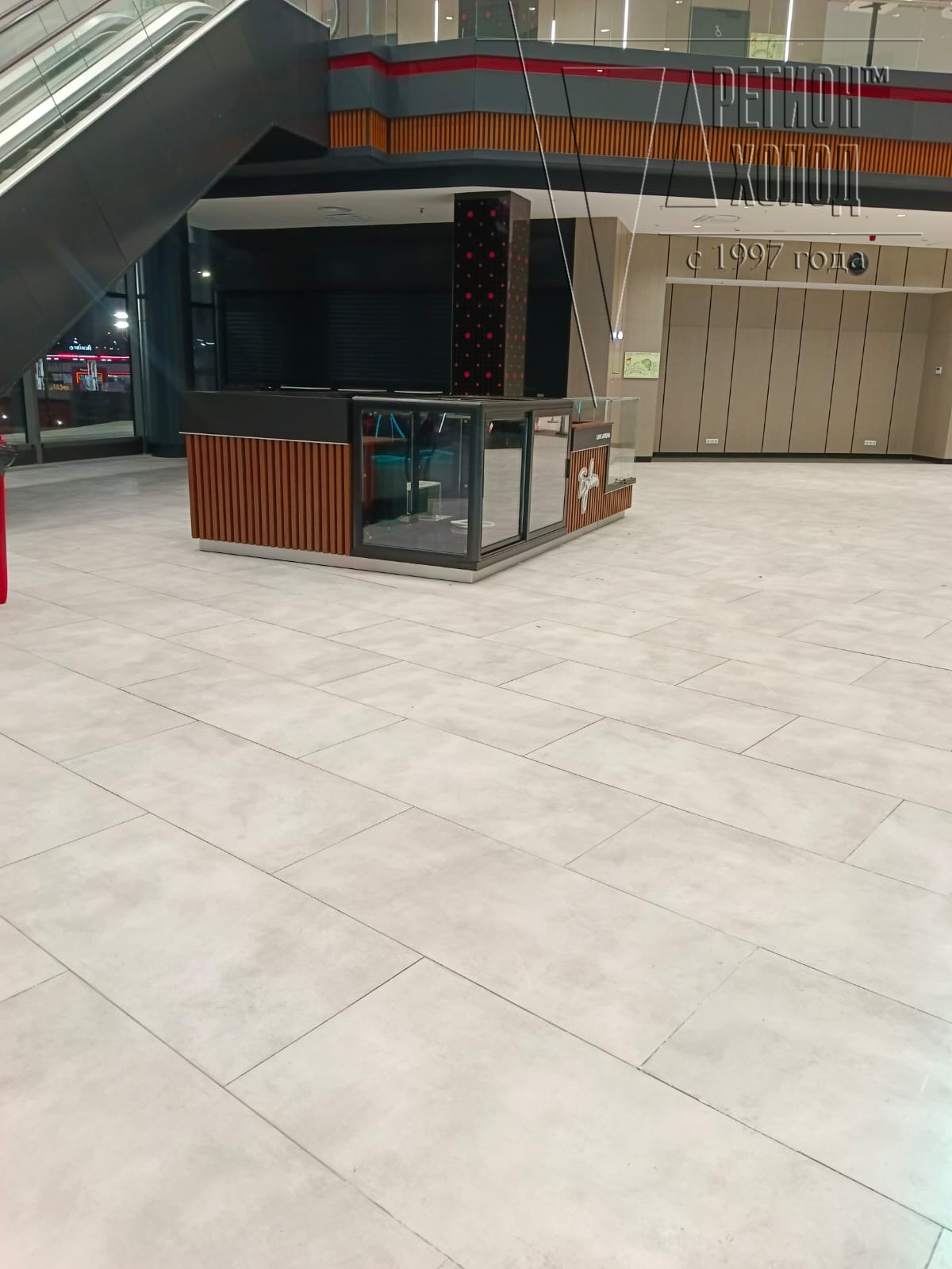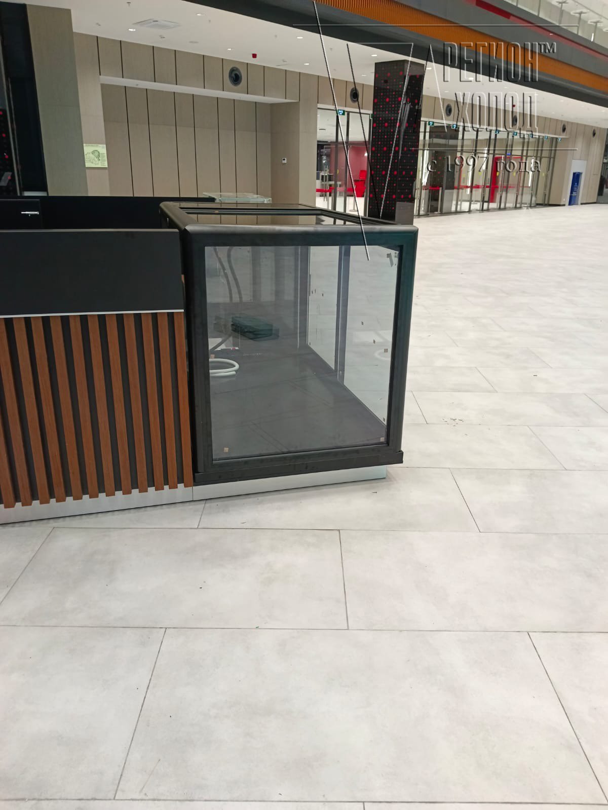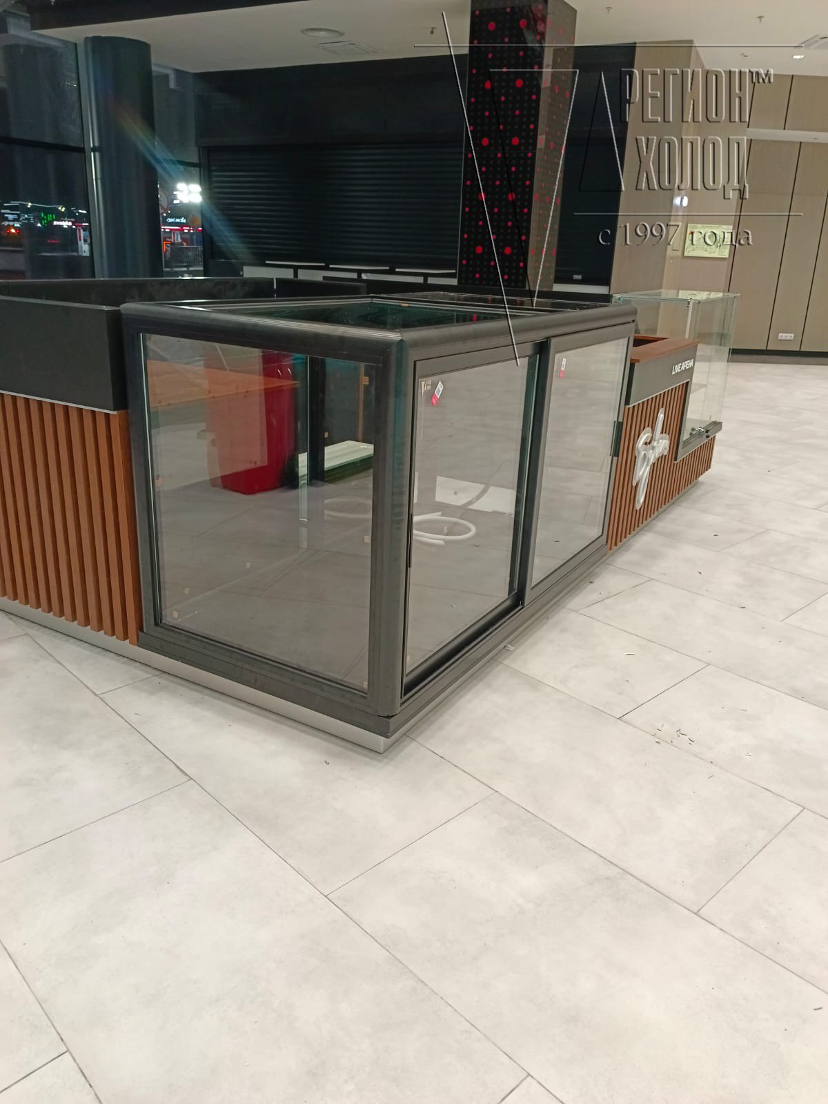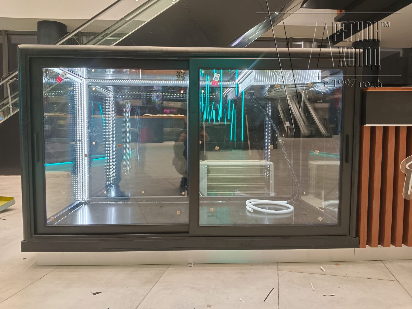 Небольшой холодильник для цветов, встроенный в островную торговую точку в ТЦ Сколково.Со стороны покупателей раздвижные двери.
